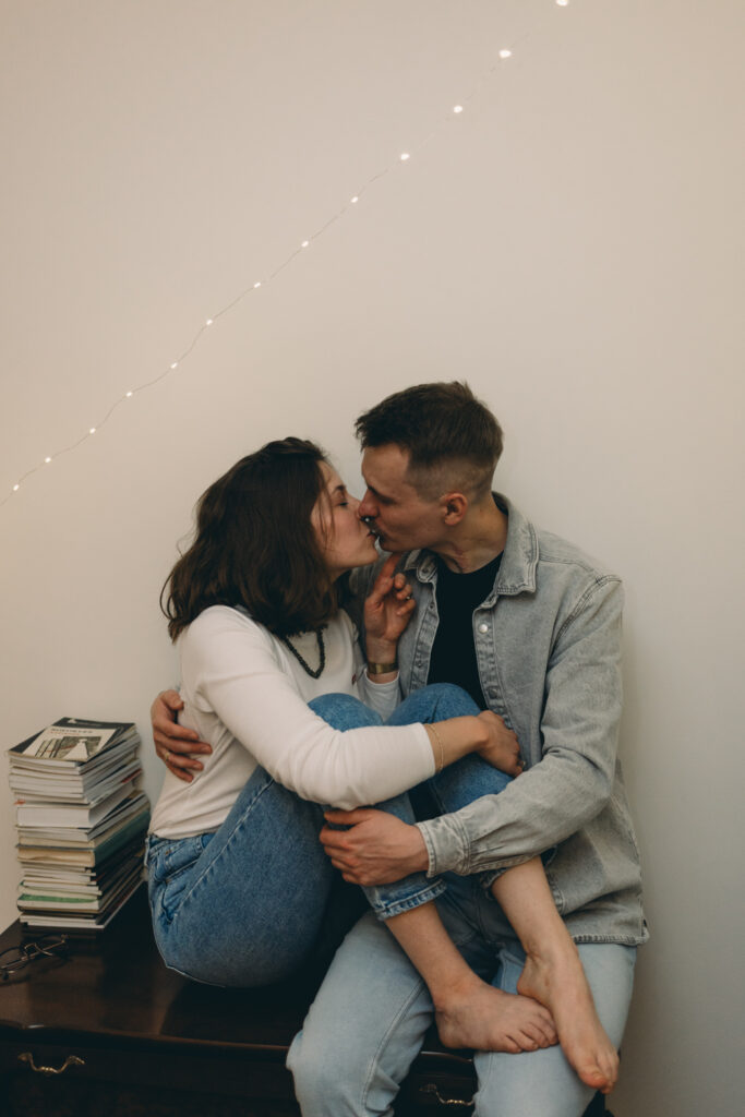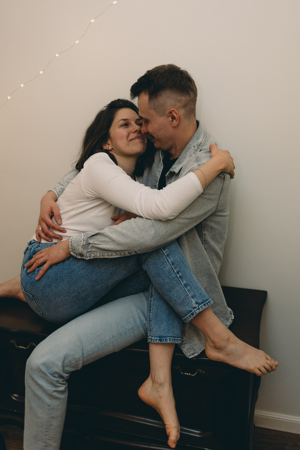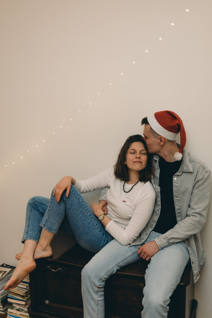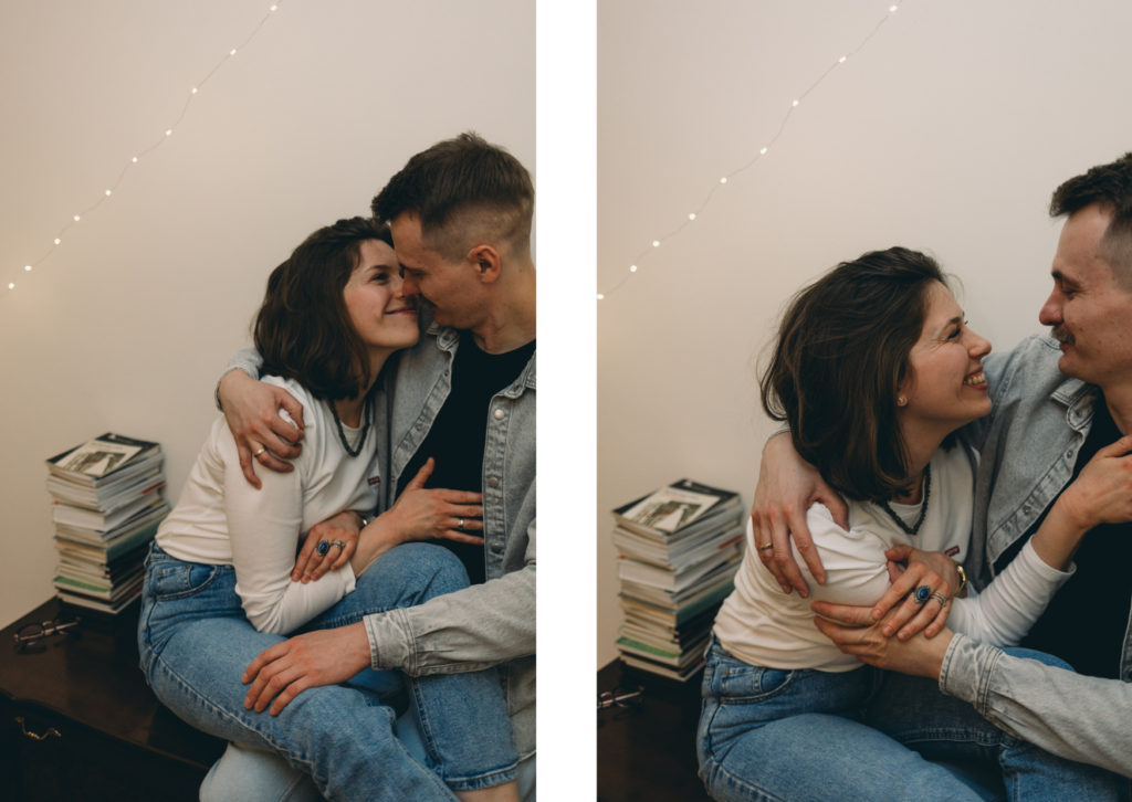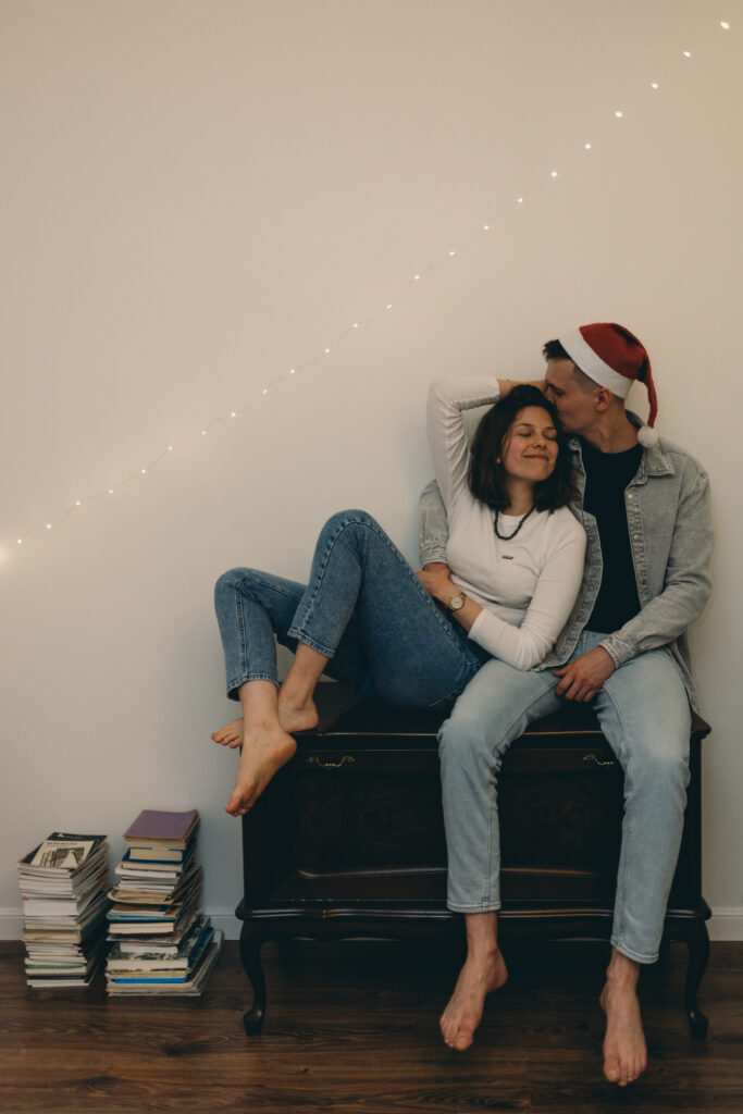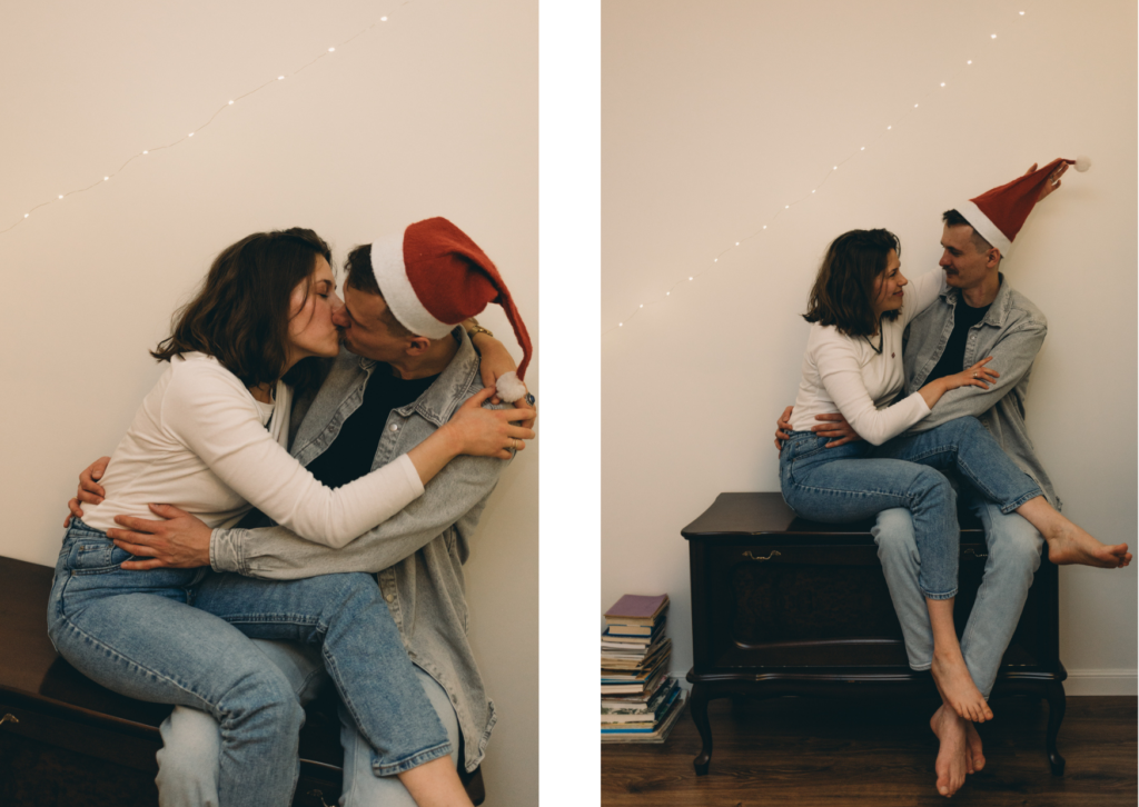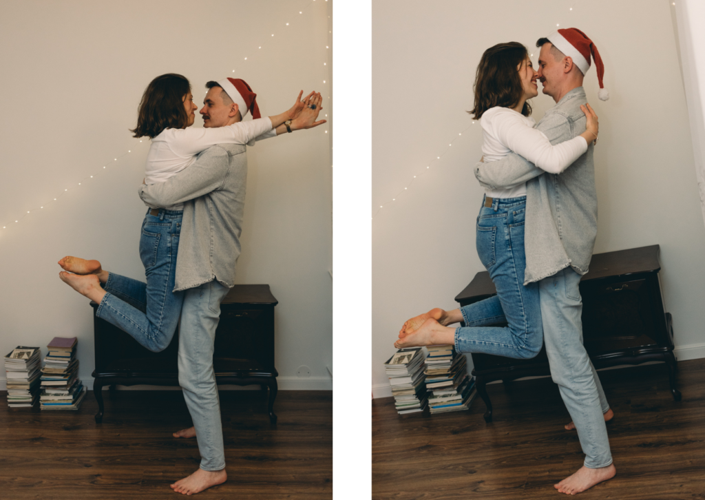 Zanim przejdziemy do zdjęć, muszę Wam coś pokazać dla kontekstu. Tę sesję świąteczną Karoliny i Dominika robiłam kilka dni temu, ale dwa lata wcześniej DOKŁADNIE W TYM SAMYM POKOJU fotografowałam ich first look w dniu ślubu. To jest właśnie ogromna siła sesji domowych – one niosą ze sobą powiązania, wspomnienia, w tych wnętrzach działo się przecież tak dużo! Przyjrzyjcie się – ta sama ściana, ten sam mebel, no i ci sami ludzie <3
